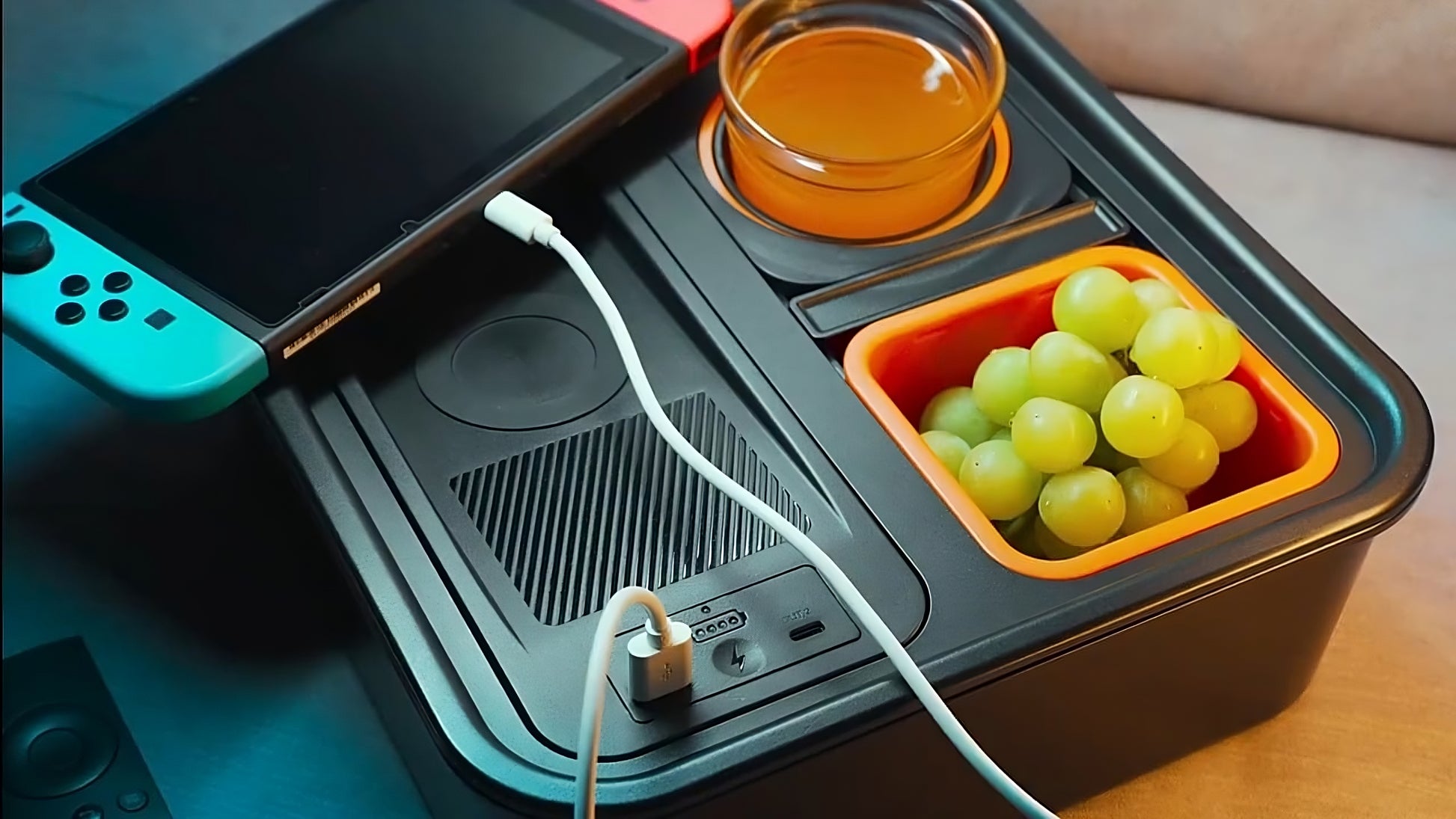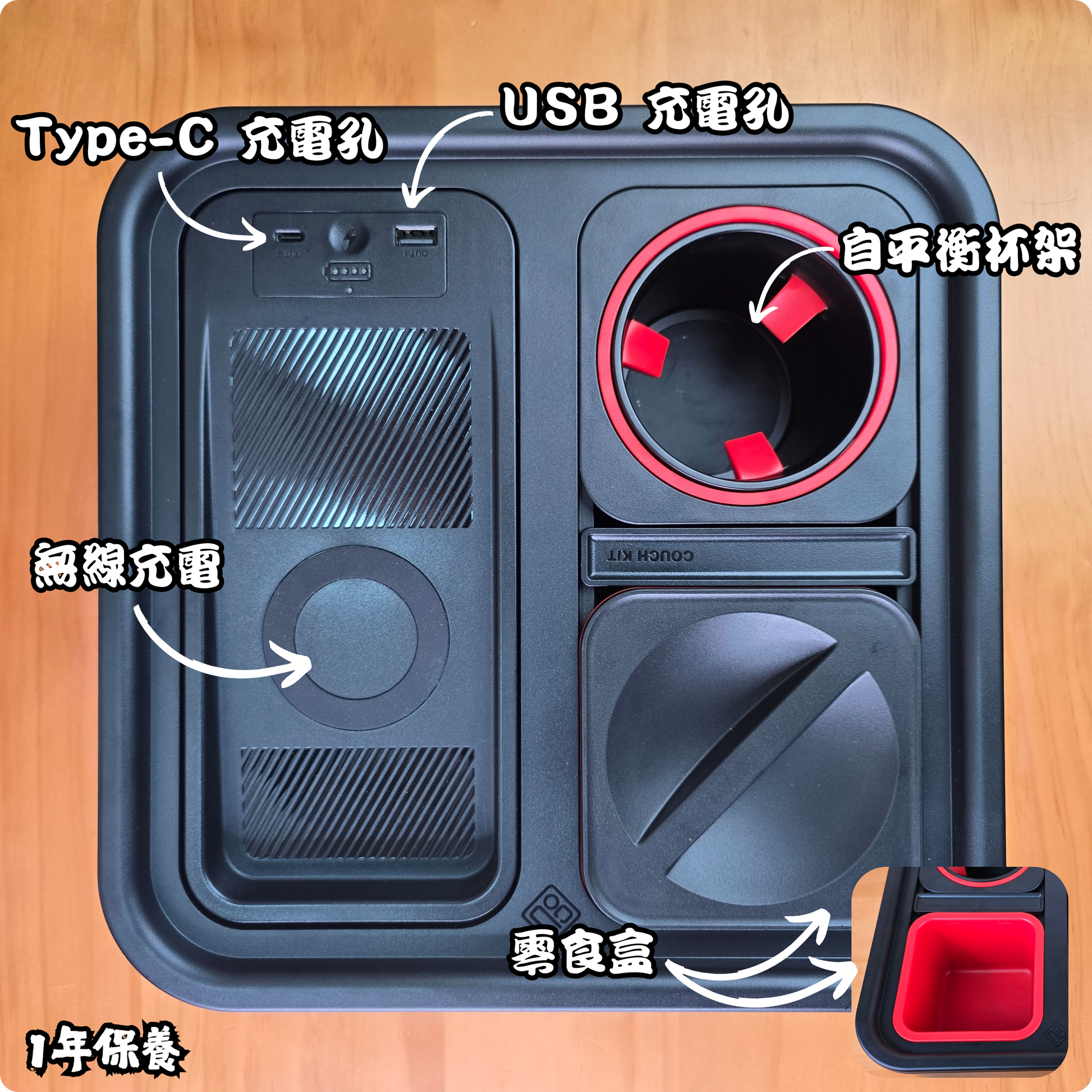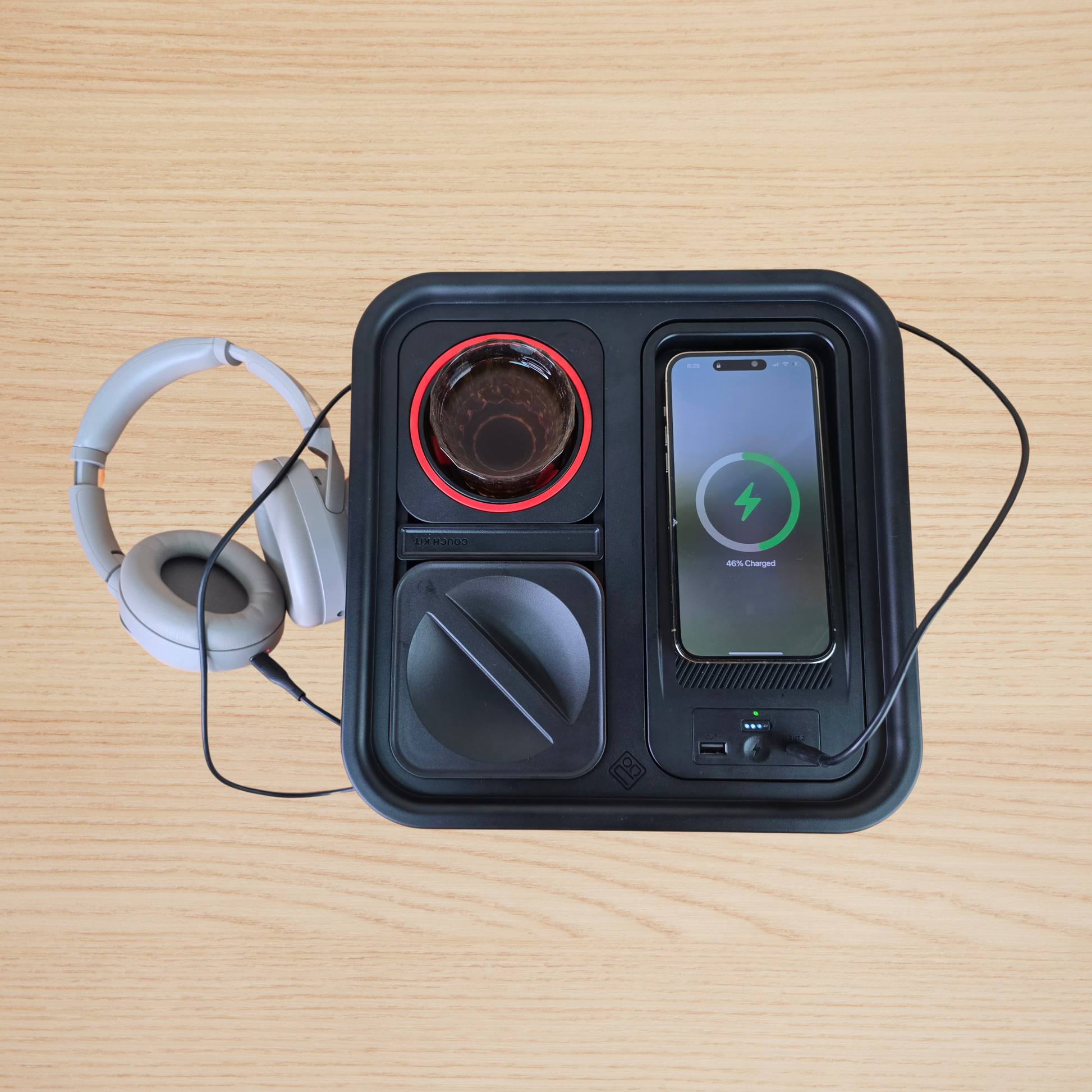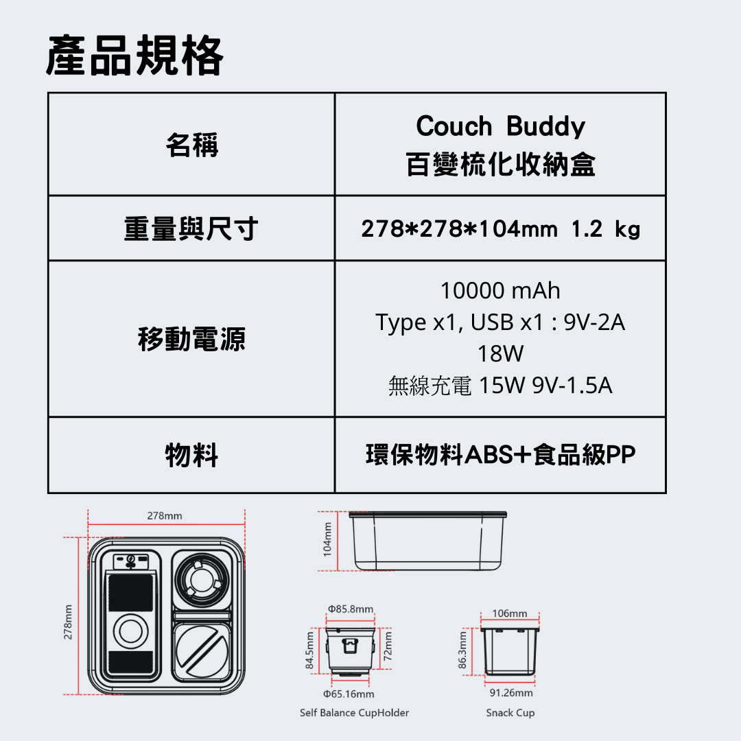 Couch Buddy 百變梳化收納盒 - 自平衡杯架、無線/有線充電、零食槽,一次滿足!